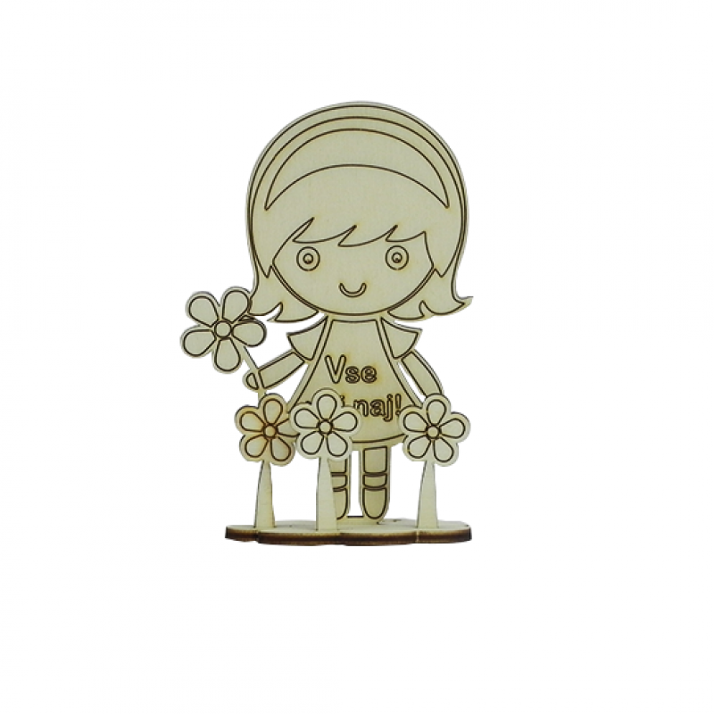 Punčka, obdana z rožami, z napisom "Vse naj naj!"