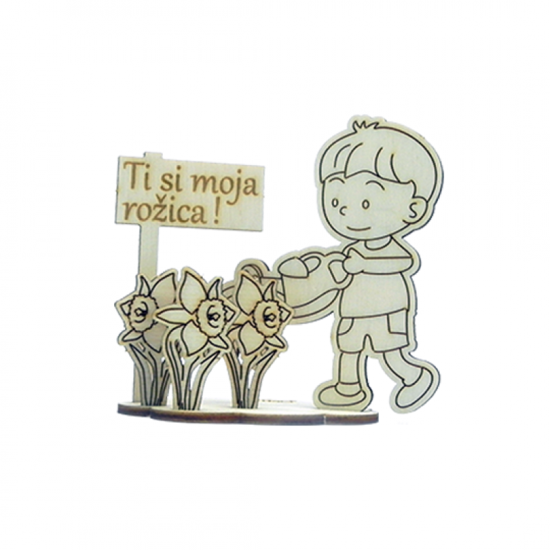deček, ki zaliva rože ter napis "Ti si moja rožica!"